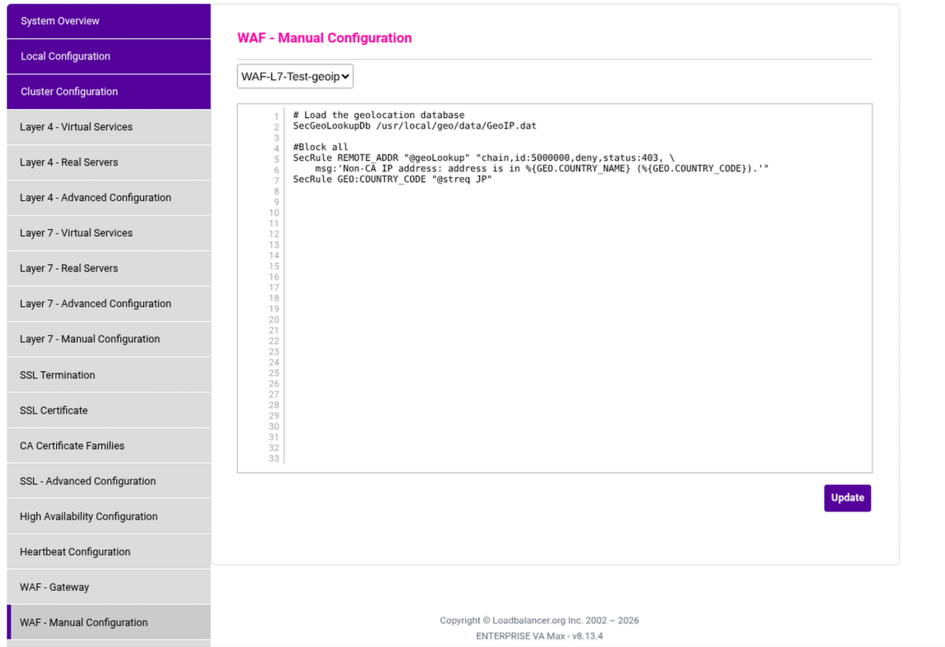 A prerequisite for this guide is that you would already have the WAF configured with “Rule Engine traffic blocking” enabled on the Loadbalancer.org appliance.