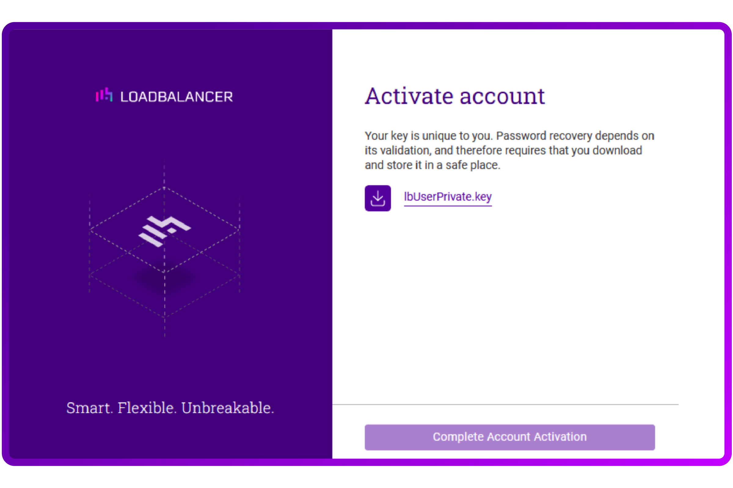 After entering the details of your account, the screen presents you with a unique lbUserPrivate.key.