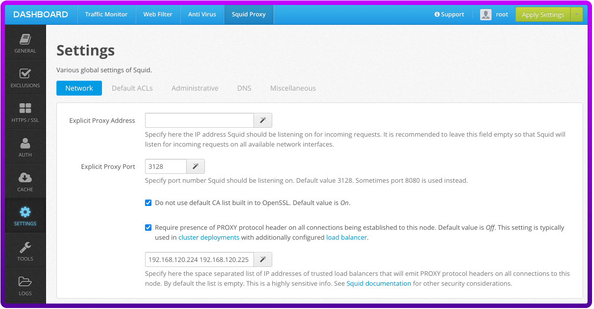 a) Navigate to “Squid Proxy” → “SETTINGS”.