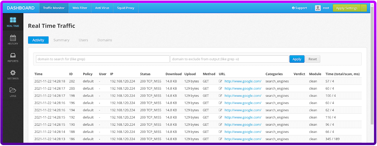 Here is where we can observe the problem we need to solve. In the Diladele web interface navigate to “Traffic Monitor” → “REAL TIME”, you’ll see the IP address of the load balancer, not that of the connecting client machine.