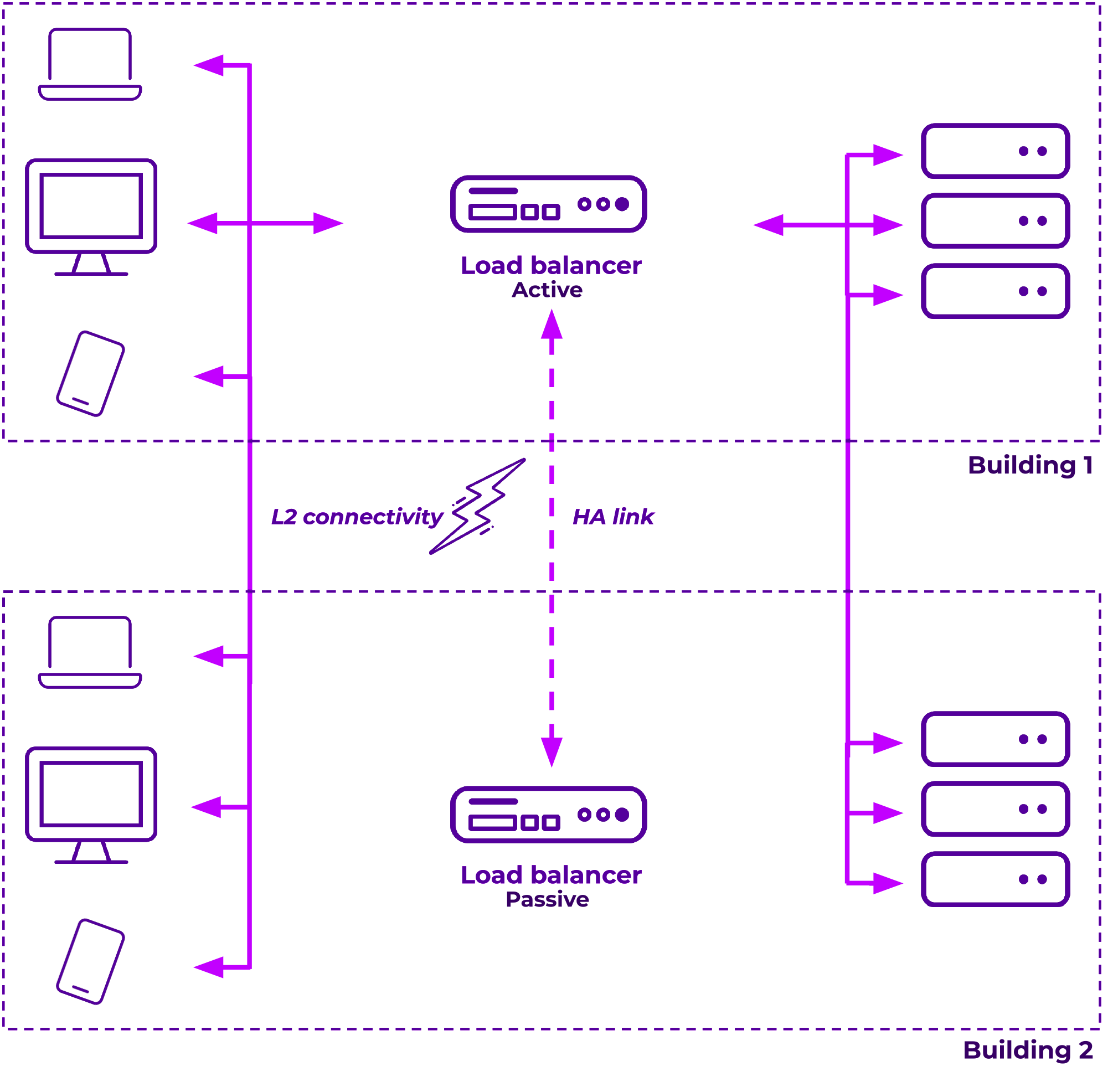 This option enables you to have an active load balancer in one location, with a passive in another, failing over the VIP address between sites using our built in HA – assuming link speed and reliability allows. Once you have the same subnet available on both sides, it's simple to setup: just pair the appliances as normal, but with one at each location.